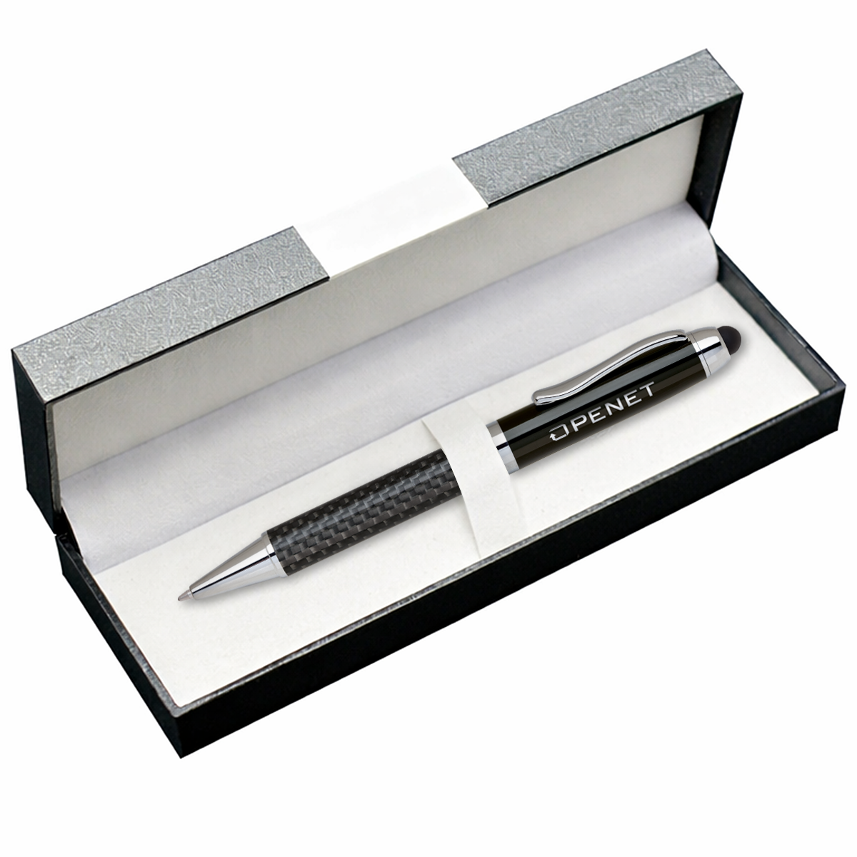 This elegant twist-action ballpoint pen combines a genuine carbon fiber barrel with solid brass construction for a satisfying heavyweight feel that's built to last. The smooth capacitive stylus tip works flawlessly on all touchscreen devices, making it the perfect 2-in-1 tool for meetings, note-taking, or quick sketches on your phone or tablet. Arrives in a deluxe single-pen presentation box with soft velvet lining, ready for gifting to clients, employees, or executives who appreciate quality and modern design. It accepts standard Parker-style refills, with choices for black or blue ink, gel options, and adjustable weight to suit any preference. Chrome accents and a sturdy clip add refined style, while the spacious barrel is ideal for sharp laser engraving, vibrant full-color prints, silkscreen, or hot stamping to showcase your logo.