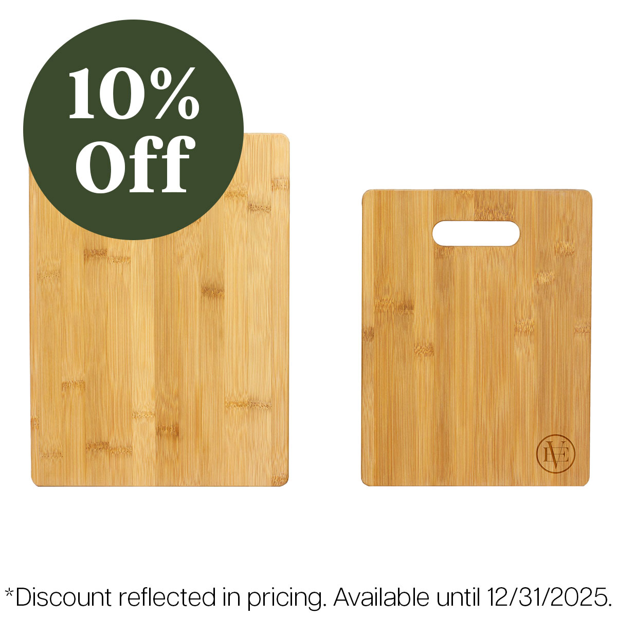 Two great board, two great sizes. Our 2-Piece cutting board set is crafted from organically grown bamboo and priced right. Boards measure: 13" x 9 1/2" x 3/8" & 11" x 8 1/2" x 3/8". Pricing includes 2 square inch engraving on 1 board. Engraving on the second board is per square inch.